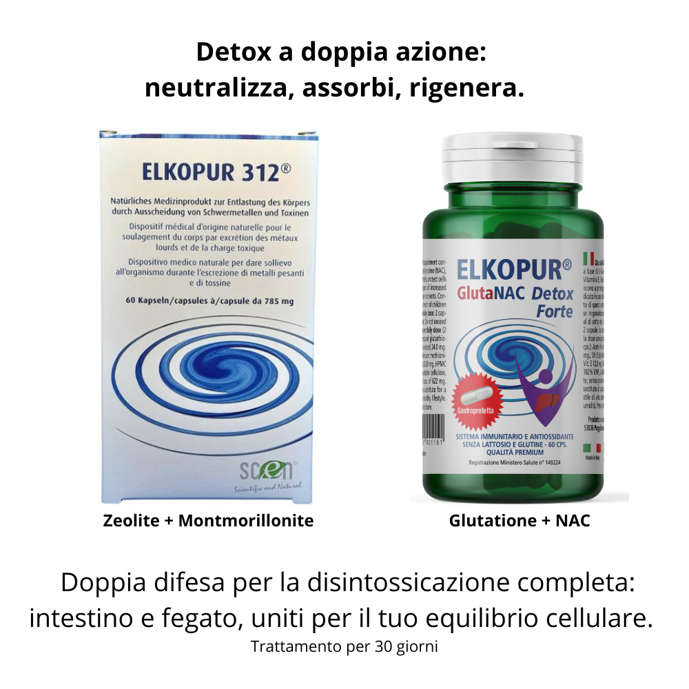 Detox a doppia azione per la disintossicazione completa: intestino e fegato, uniti per il tuo equilibrio cellulare. 🌱 Elkopur312 e Glutanac Detox: sinergia funzionale tra adsorbimento intestinale e supporto epatico antiossidante.Â