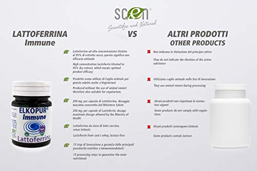 Elkopur Immune Pure lactoferrin, 500 mg capsules. containing 200 mg. of Lactoferrin titrated 95%. DOES NOT use animal rennet - vegetarian ok | Strengthens the immune system | Antioxidant (1)
